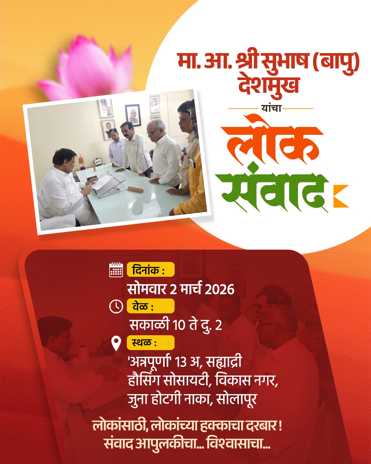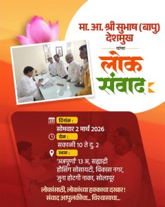 सोलापूर शहरासह जिल्ह्यातील सर्वसामान्य नागरिकांच्या अडीअडचणी, प्रलंबित प्रश्न आणि तक्रारींचे निराकरण करण्यासाठी माजी सहकार मंत्री तथा मा. आमदार श्री. सुभाष (बापू) देशमुख यांच्या वतीने उद्या, सोमवार २ मार्च २०२६ रोजी विशेष ‘लोकसंवाद’ कार्यक्रमाचे आयोजन करण्यात आले आहे. ‘लोकांसाठी, लोकांच्या हक्काचा दरबार’ ही संकल्पना घेऊन हा उपक्रम राबविला जात आहे.