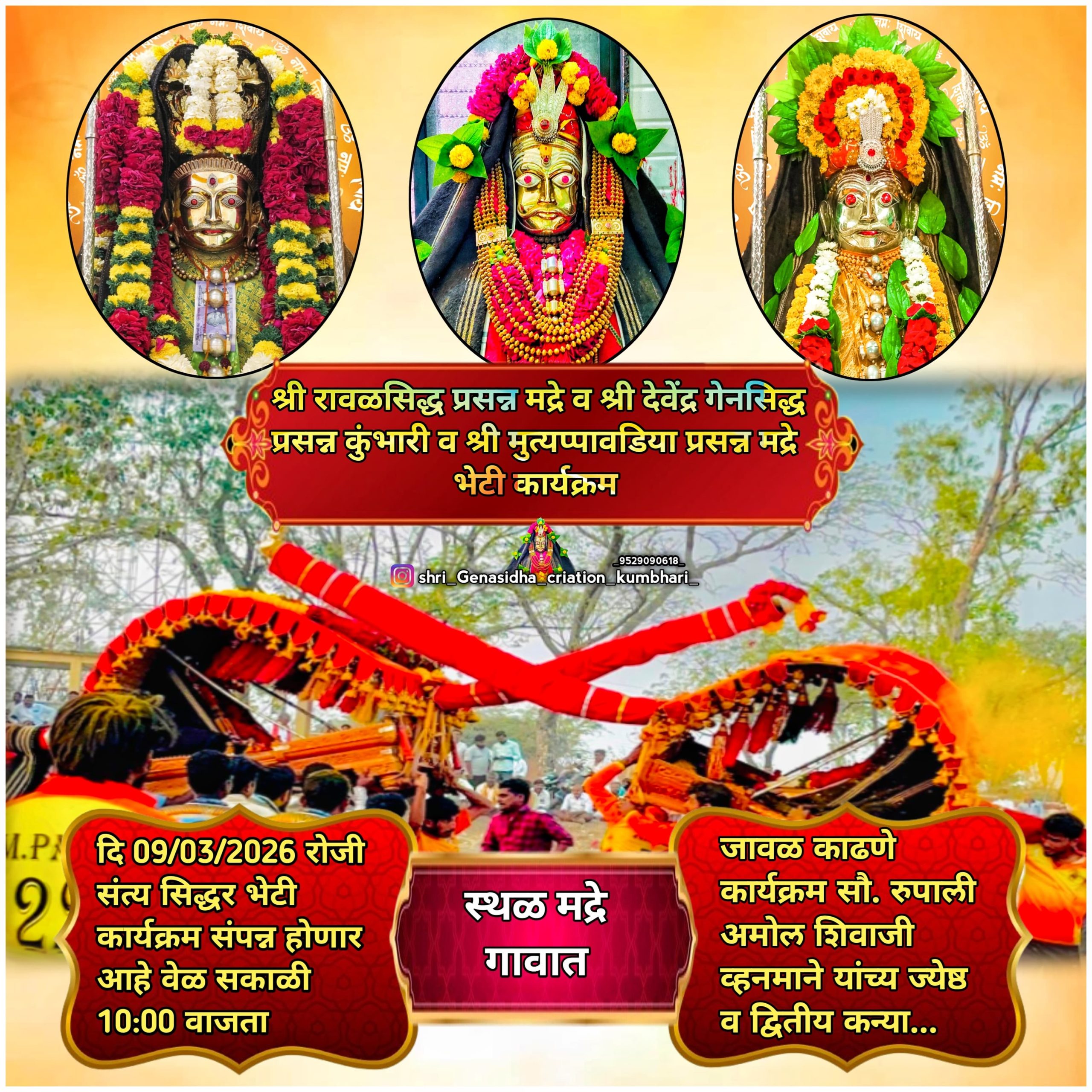 यामध्ये श्री रावळसिद्ध प्रसन्न – मद्रे, श्री देवेंद्र गेनसिद्ध प्रसन्न – कुंभारी, आणि श्री मुत्यप्पावडिया प्रसन्न – मद्रे या दिव्य दैवतांच्या शुभ भेटीचा आणि आशीर्वादाचा हा सुवर्णक्षण आपल्याला अनुभवता येईल.