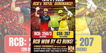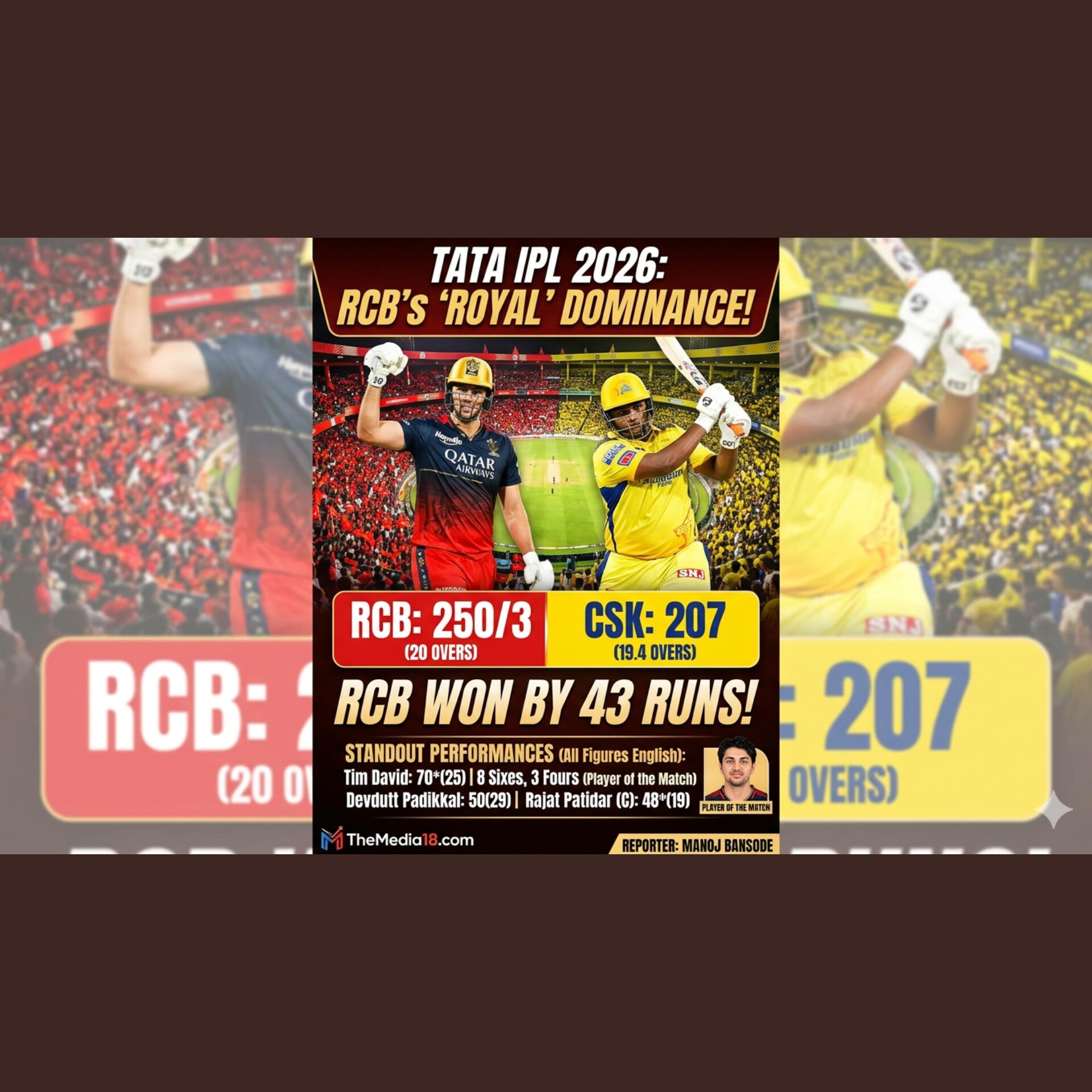 बेंगळुरू: आयपीएल 2026 मधील सर्वात मोठ्या हाय-व्होल्टेज सामन्यात Royal Challengers Bengaluru (RCB) संघाने आपल्या घरच्या मैदानावर Chennai Super Kings (CSK) विरुद्ध ऐतिहासिक विजय नोंदवला. फलंदाजांच्या तुफानी फटकेबाजीनंतर गोलंदाजांनी केलेल्या अचूक माऱ्यामुळे आरसीबीने चेन्नईचा 43 धावांनी पराभव करून गुणतालिकेत अव्वल स्थान पटकावले आहे.